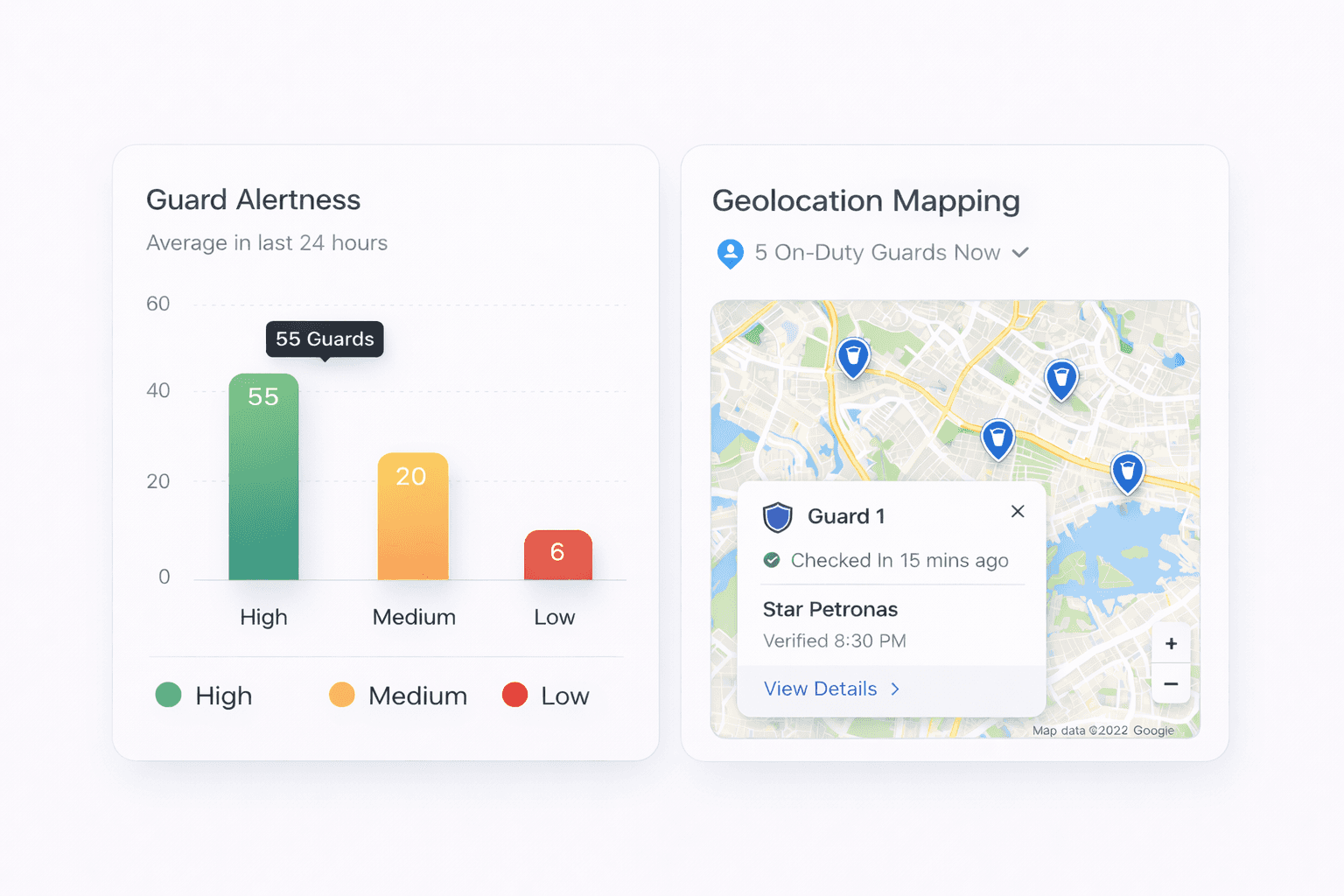 Understand workforce performance at a glance with real-time updates — combining attendance, geo-location mapping, incident reports, supervisor ratings, and document verification status.